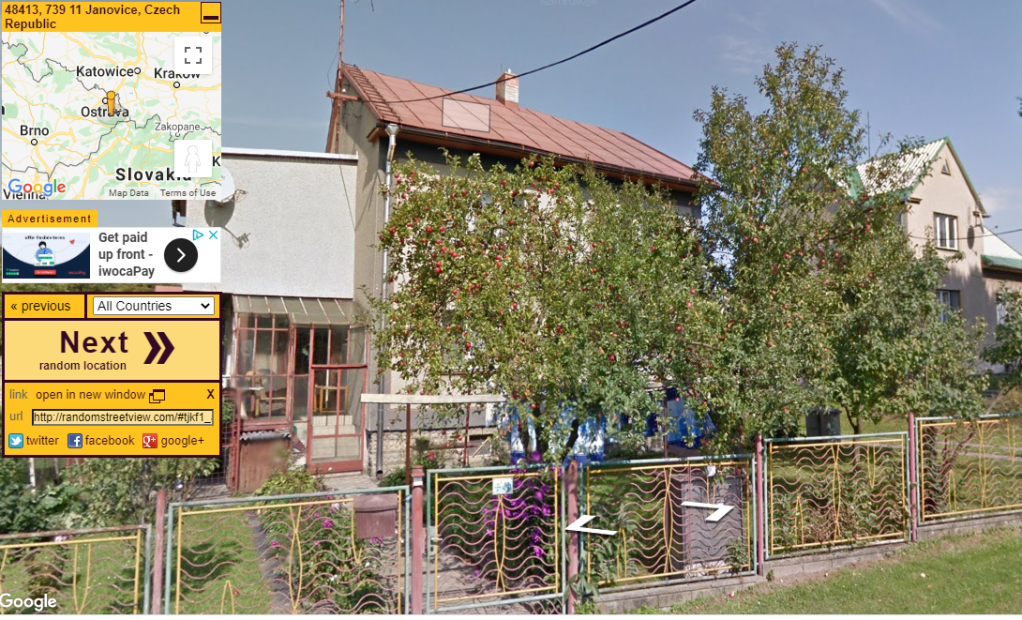 Here’s a site that has kept me entertained – Random Street View Which, as it says, brings up a different view of anywhere in the world. You can travel from Greece to Singapore to Sweden in three clicks. I like to see if I can guess what country, or at least what part of the world the view shows, before I peek at the little map. Sometimes you’ll see some fruit trees like these or a grove of bananas, or olive trees, but I’ve yet to see an apple orchard. If you find one let me know.